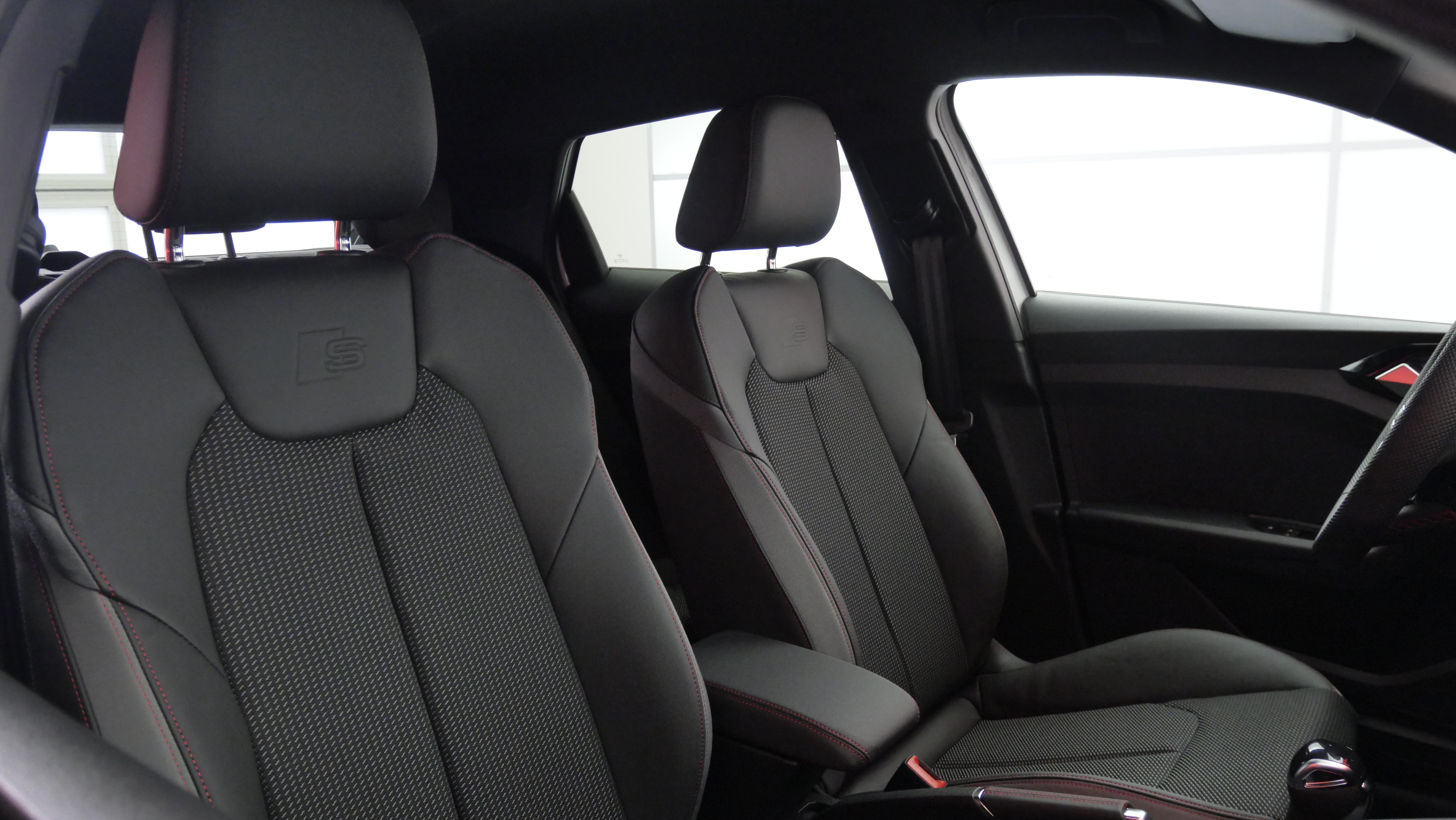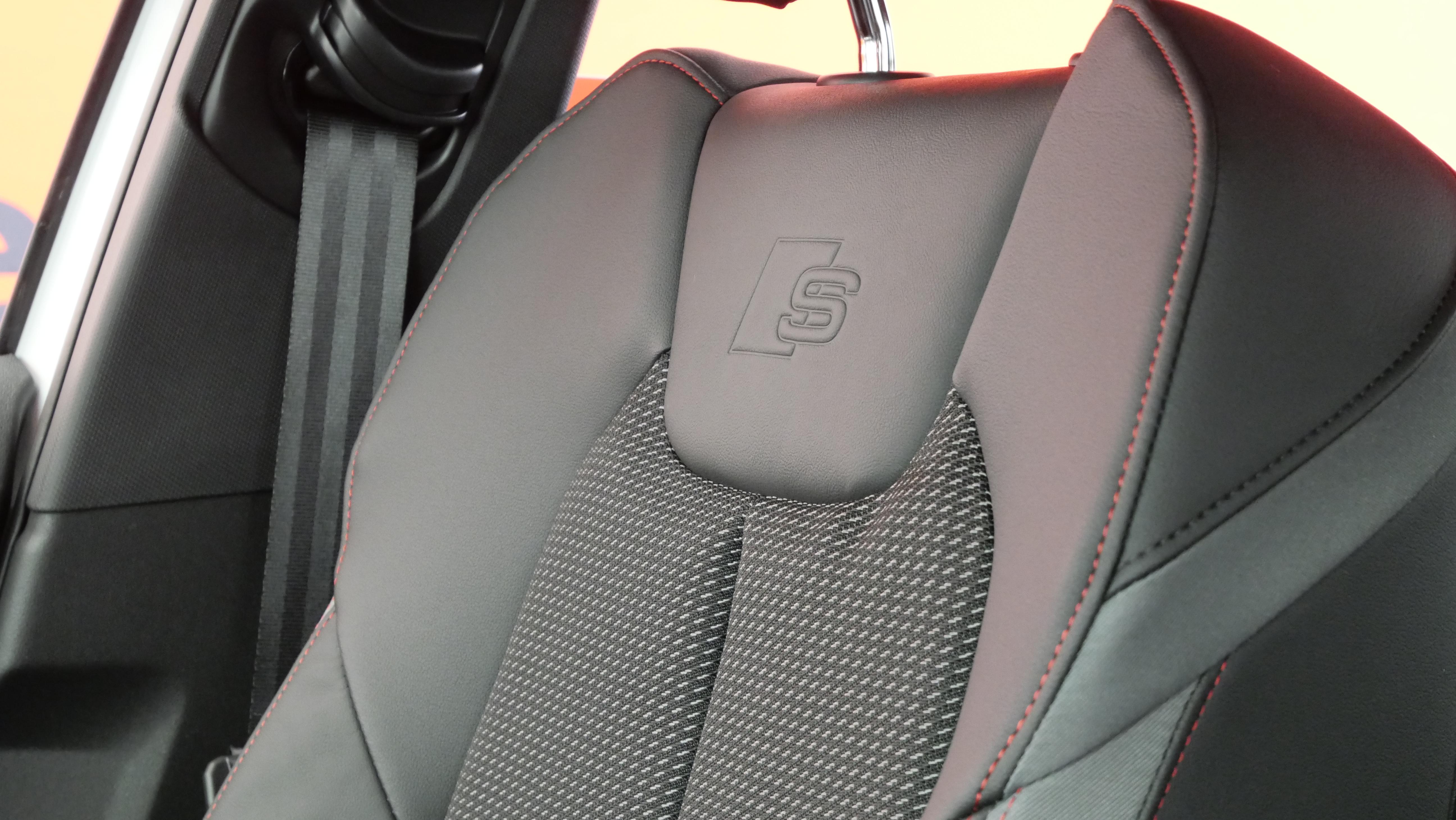 • Sièges Sport cuir/tissu avec surpiqûre contrastée et estampillage S sur le dossier des sièges AV Avec appui lombaire manuel à 2 axes. Avec bourrelets latéraux enveloppants pour un meilleur maintien en virage.