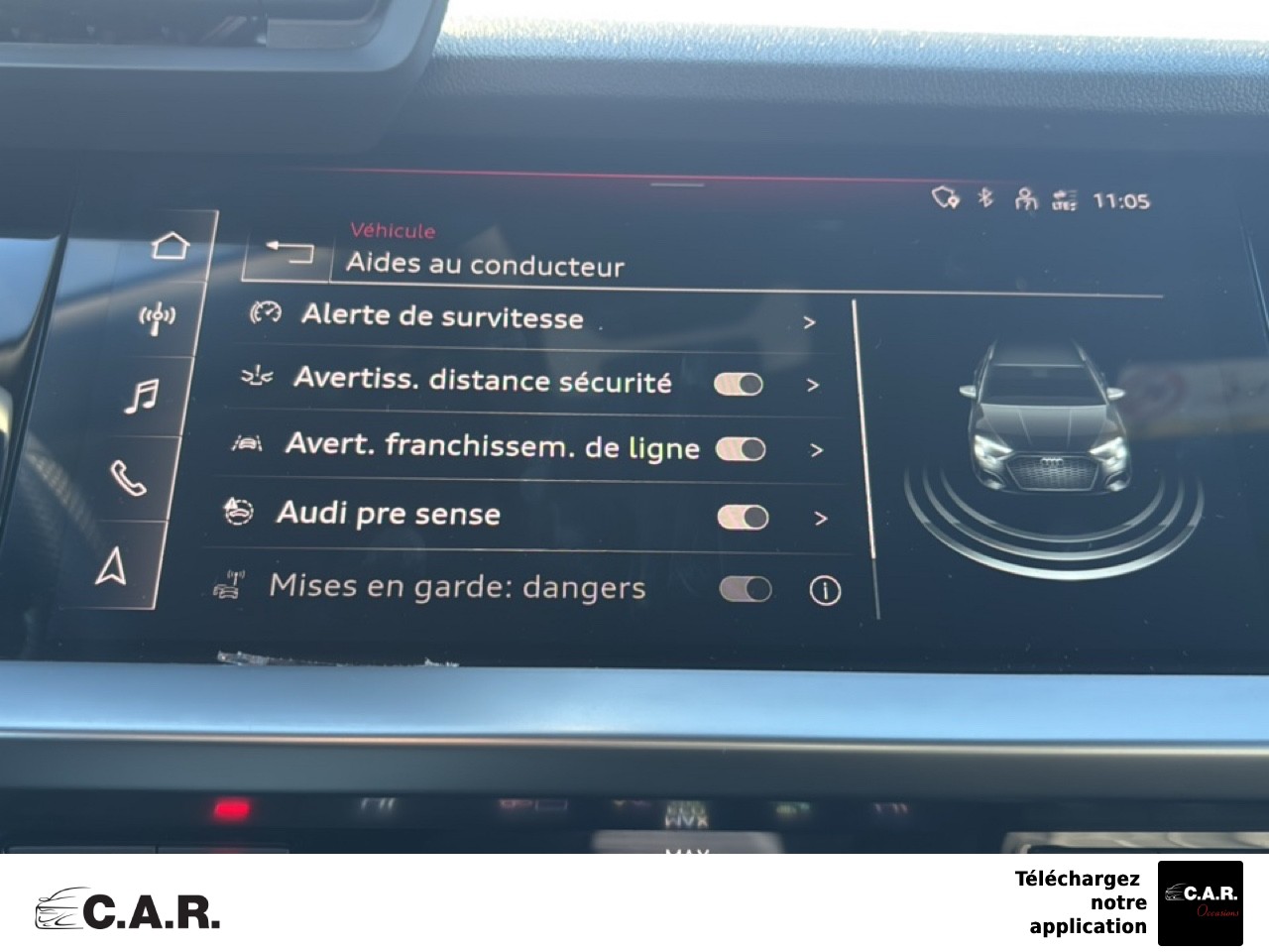 • Audi sound system : 10 HP incluant un HP central et un subwoofer, amplificateur à 6 canaux avec une puissance totale de 180 watts