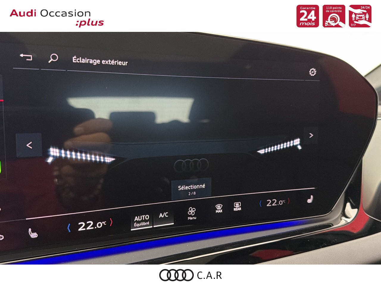 • Pack Tech - Caméra de recul - Régulateur de vitesse adaptatif - Park assist plus - Système d'aide au stationnement plus - Projecteurs à LED plus - Assistant feux de route - Bloc de feux AR à LED pro - Climatisation automatique 3 zones - Rétroviseur intérieur à réglage jour/nuit automatique - Rétroviseurs ext. réglables - Projection de logo sur le sol depuis les rétroviseurs extérieurs - Audi sound system - Audi Application Store et smartphone interface