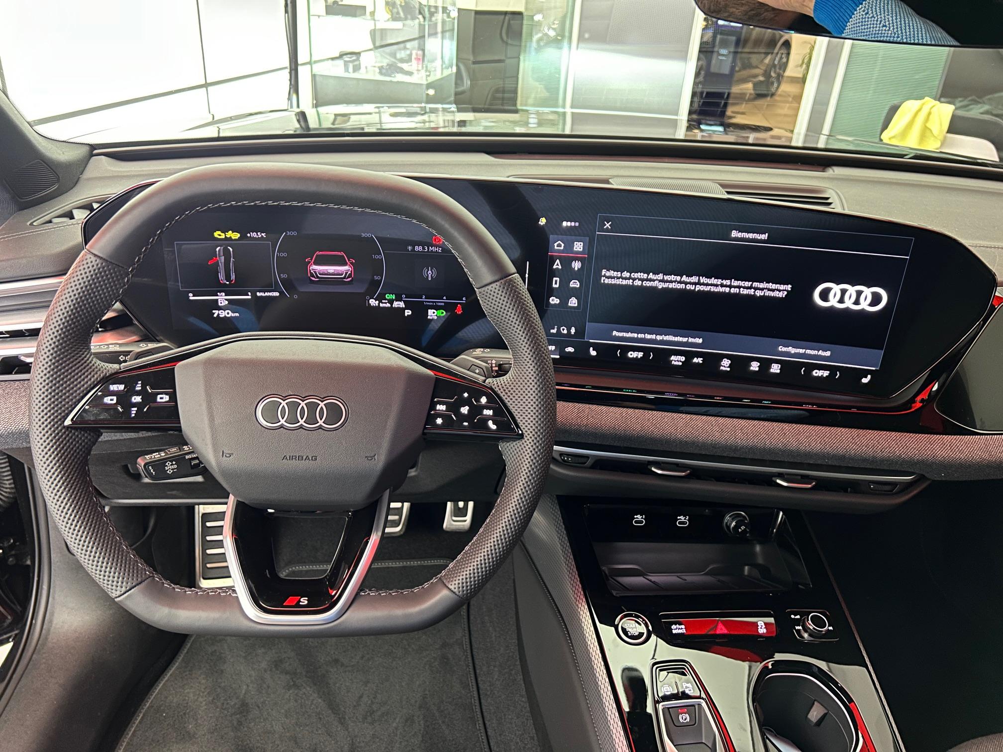• Pack Tech - Caméra de recul - Régulateur de vitesse adaptatif - Park assist plus - Système d'aide au stationnement plus - Projecteurs à LED plus - Assistant feux de route - Bloc de feux AR à LED pro - Climatisation automatique 3 zones - Rétroviseur intérieur à réglage jour/nuit automatique - Rétroviseurs ext. réglables - Projection de logo sur le sol depuis les rétroviseurs extérieurs - Audi sound system - Audi Application Store et smartphone interface