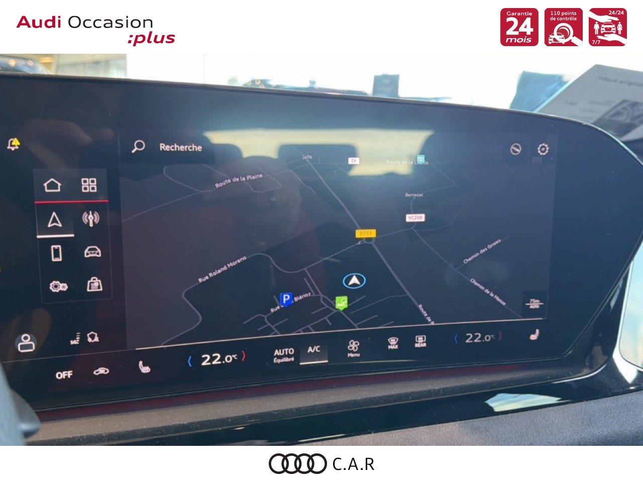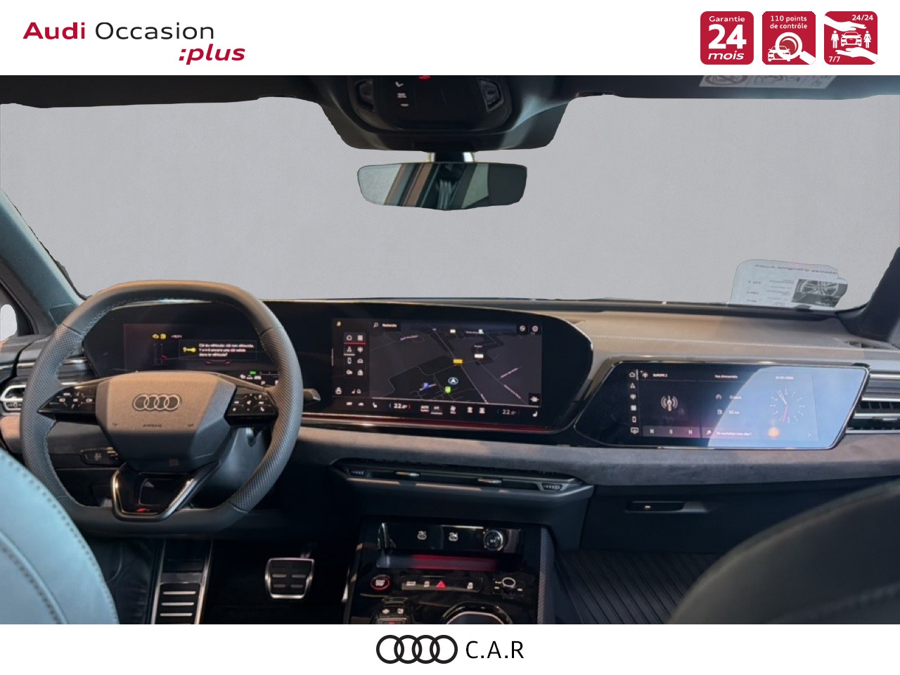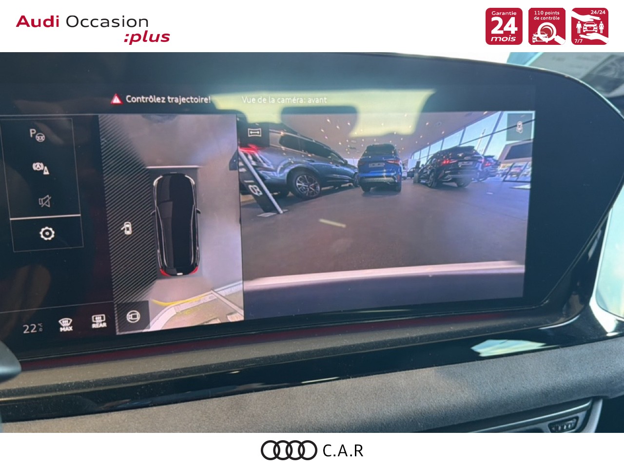 • Pack Tech Caméra de recul. Régulateur de vitesse adaptatif. Park assist plus.Système d'aide au stationnement plus.Alerte de sortie de voie.Projecteurs à LED plus. Assistant feux de route.Climatisation automatique 3 zones. Rétroviseur intérieur à réglage jour/nuit automatique. Rétroviseurs ext. réglables dégivrants et rabattables électriquement à réglage jour/nuit automatique des 2 côtés.Projection de logo sur le sol depuis les rétroviseurs extérieurs. Audi sound system.Audi Application Store