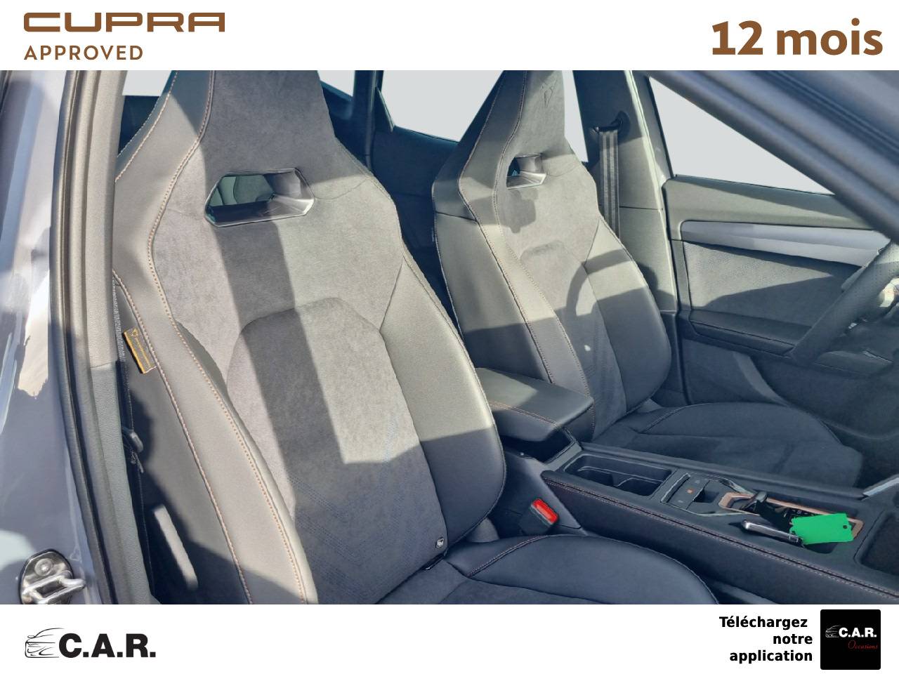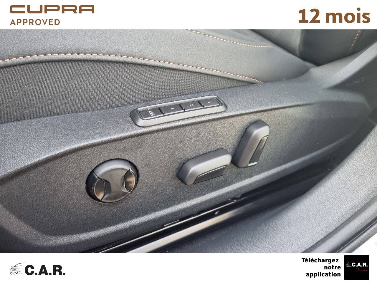 • Design intérieur Dynamic - Sièges baquets suédine Noir Asphalte avec poinçonnage Bleu Astral et surpiqûres cuivrées - Logos CUPRA estampés sur les appuie-têtes - Planche de bord noire surpiquée avec inserts Dark Alu - Contre-portes suédine noire avec poinçonnage Bleu Astral - Siège conducteur : chauffant avec réglage électrique à mémoire, y compris réglage lombaire - Siège passager : chauffant avec réglage manuel de la hauteur