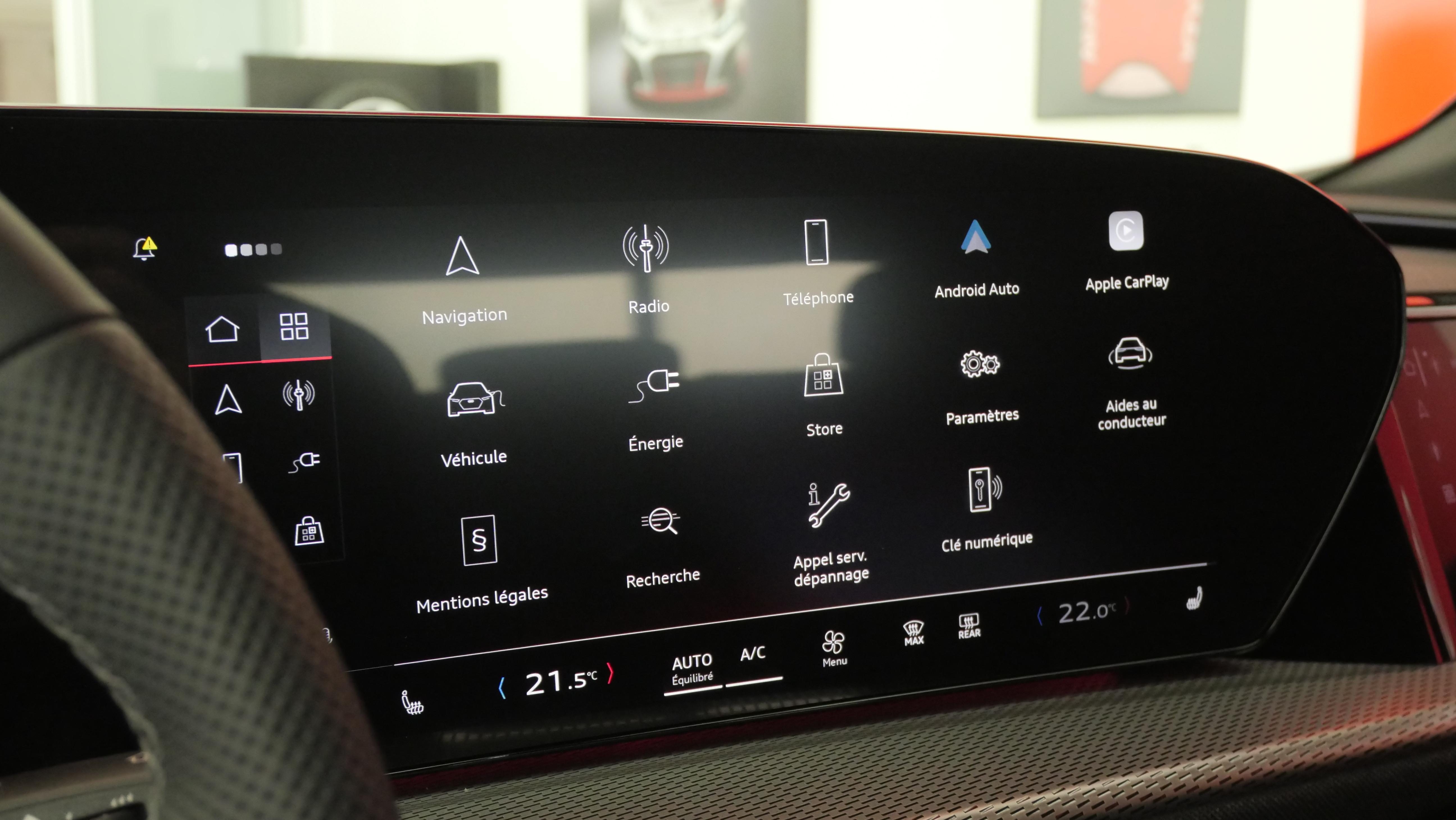 • MMI Navigation plus avec MMI touch Le système de navigation MMI plus avec MMI touch offre : - l'écran panoramique MMI avec technologie OLED, comprenant l'Audi virtual cockpit plus avec écran de 11,9 pouces ainsi que l'écran MMI touch de14,5" - système de navigation avec affichage des cartes et guidage routier sur l'écran couleur haute résolution de 14,5" - mise à jour des cartes en ligne - Affichage de cartes en 3D montrant de nombreux sites d'intérêt - informations routières en ligne - MMI search - MMI touch