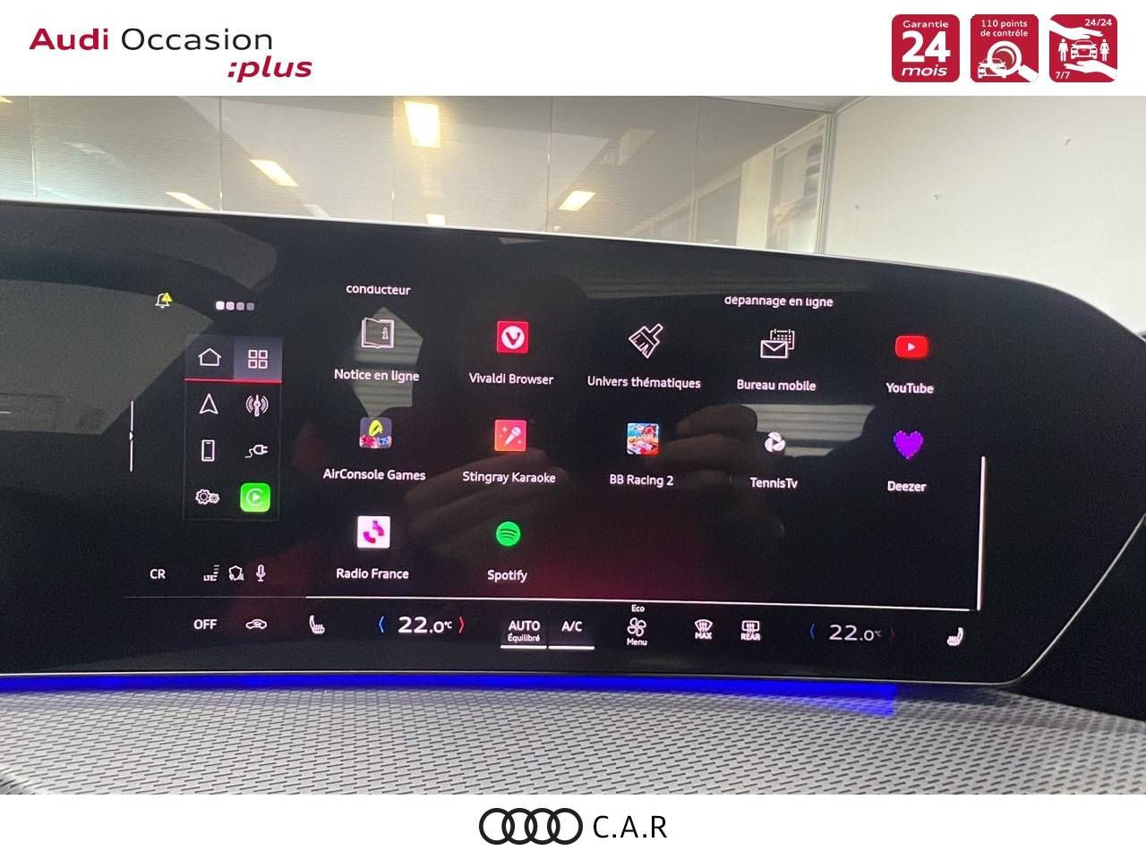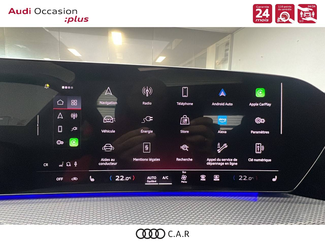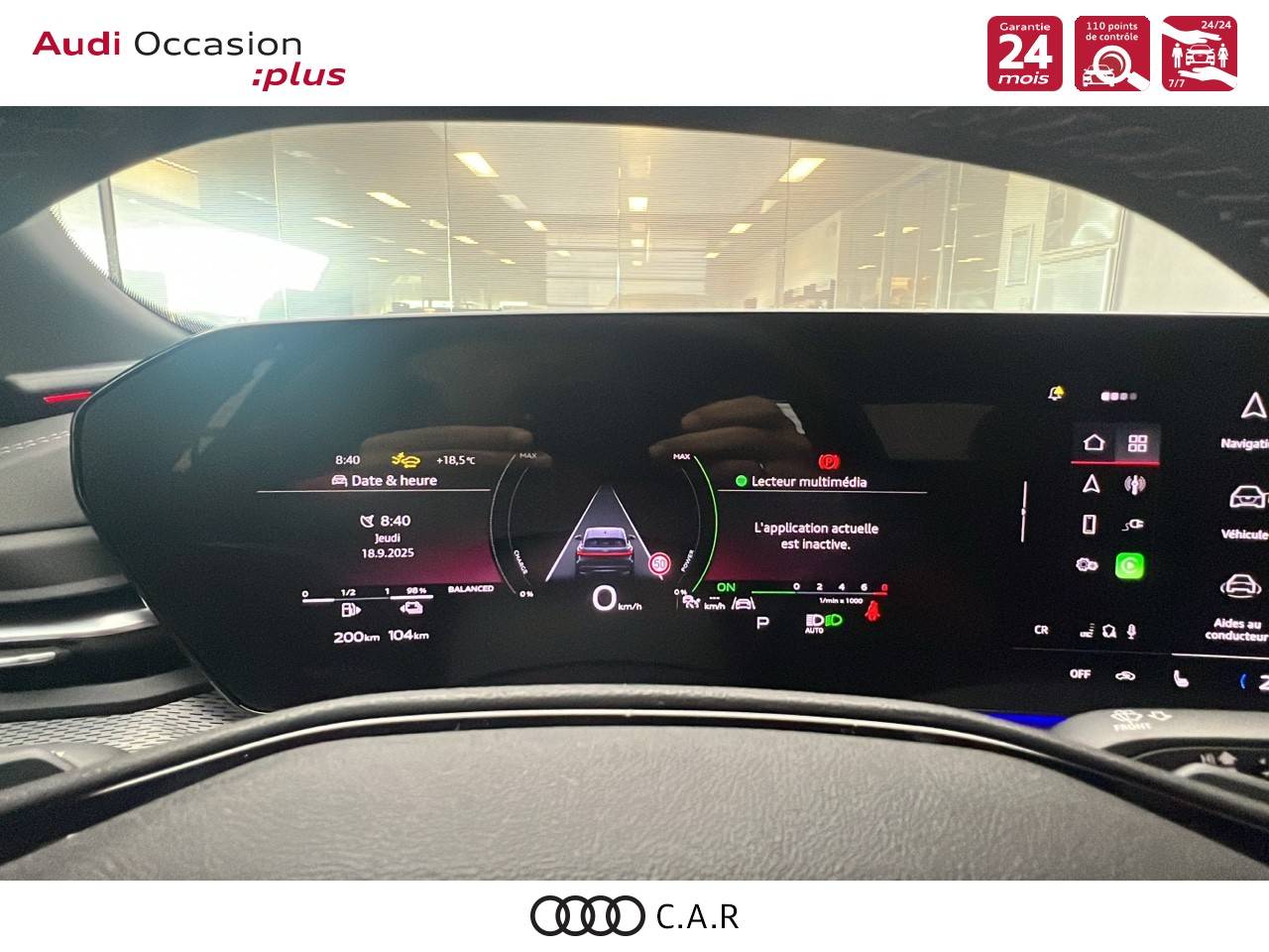 • Pack Tech -Clim. auto. 3 zones, -Rétroviseur int. à réglage jour/nuit auto., -Rétroviseurs ext. réglables, dégivrants et rabattables électriquement., -Projection de logo sur le sol depuis les rétroviseurs ext, -Lave-projecteurs, -Audi Application Store et smartphone interface, -Audi sound syst., -Projecteurs à LED plus, -Assistant feux de route, -Bloc de feux AR à LED pro, -Syst. d'aide au stationnement plus, -Park assist plus, -Caméra de recul, -Régulateur de vitesse adapt.