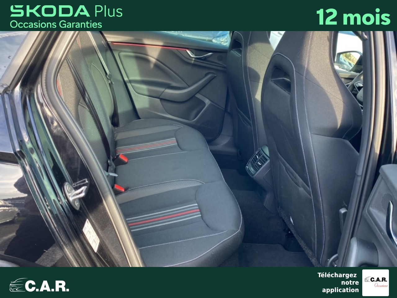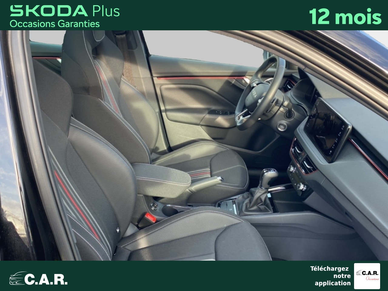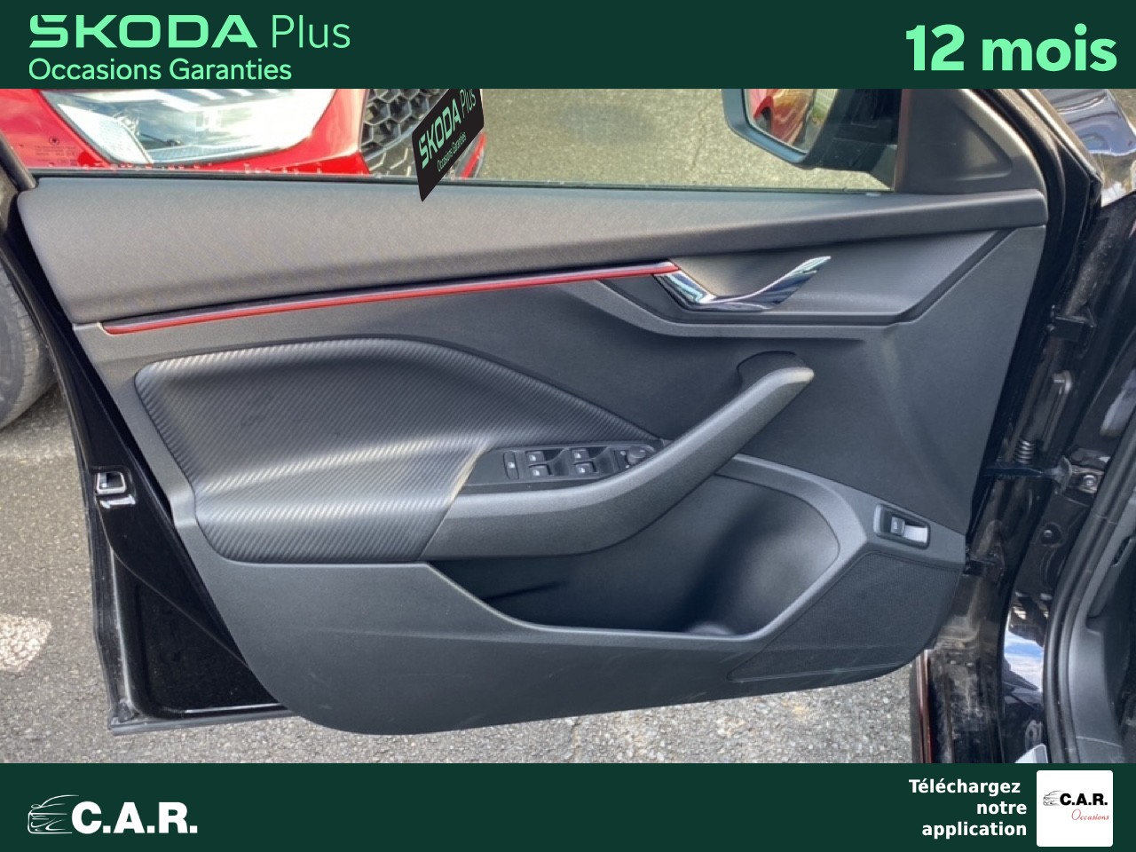 • Insert décoratif sur la planche de bord effet carbone avec liseré rouge et inserts de porte matériau synthétique effet carbone