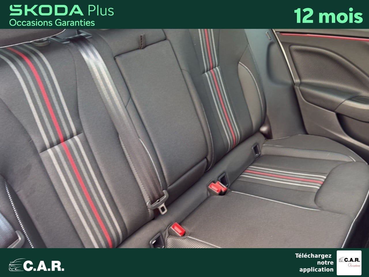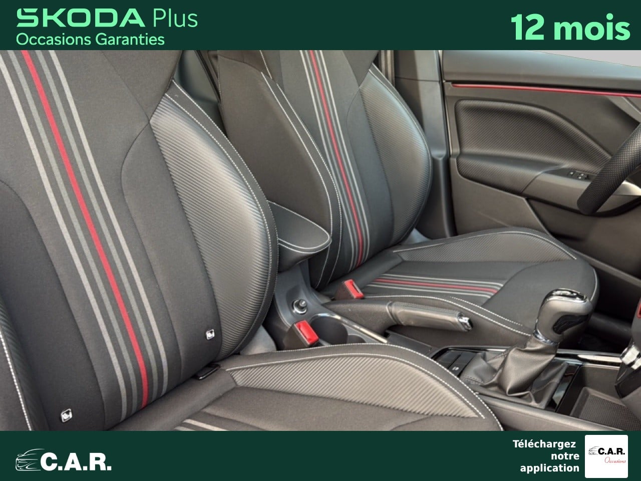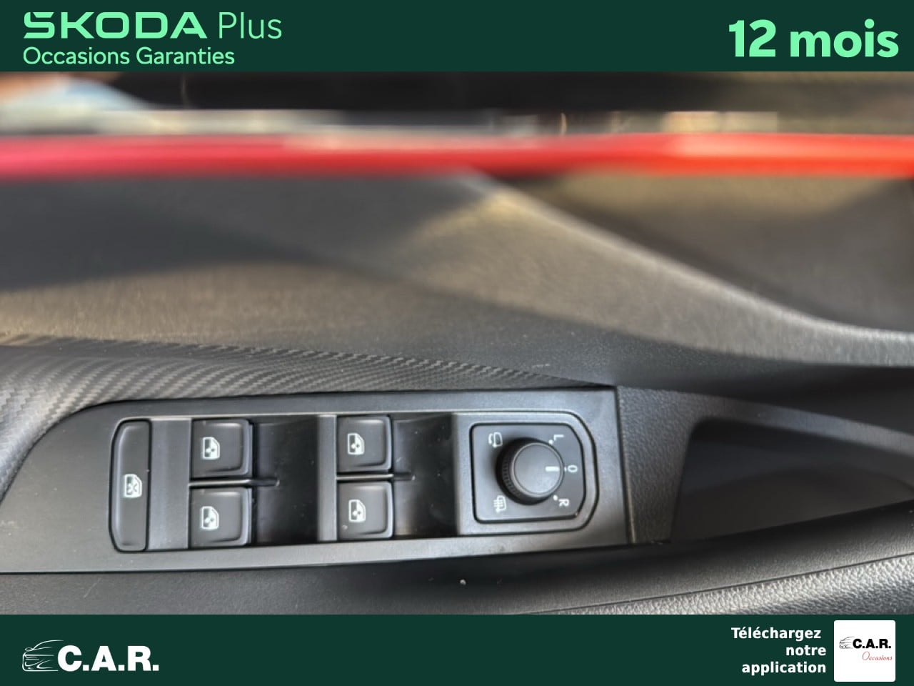 • Insert décoratif sur la planche de bord effet carbone avec liseré rouge et inserts de porte matériau synthétique effet carbone